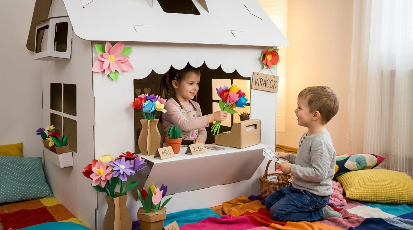 A Virágárus standunk nem egyszerűen egy karton házikó, hanem egy saját, bebújós világ, ahol a gyerek elvonulhat, megnyugodhat, és új történeteket alkothat. Lehet belőle virágbolt, kis üzlet, kastélyszoba, titkos rejtekhely vagy akár egy varázslatos kuckó – mindig azzá válik, amivé a gyerek képzelete formálja.